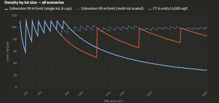 The third clause dictates that existing homes cannot be prevented by local ordinances from subdividing into 3 separate units. This law, perhaps with good intentions, will lack the increased incentives for homeowners and developers to act, leaving our housing supply at its current level. There would need to be surplus returns possible for the existing inertia in the status quo system to change. The limitation to 3 units would constrict the space for profit, and further deregulation to 4-8 units should be considered like was put into place in Edmonton. This combined with an unrealistically low 5000sqft maximum plot limit would cause the bill to provide inadequate results. Making a compromise on the plot limits to the average in Edmonton of ~6500sqft and raising the unit limit to 8 units would increase density in a given area by almost double (see figure 1). Limiting to 6 units over the same square feet would still lead to a significant reduction even as a compromise (see figure 2).